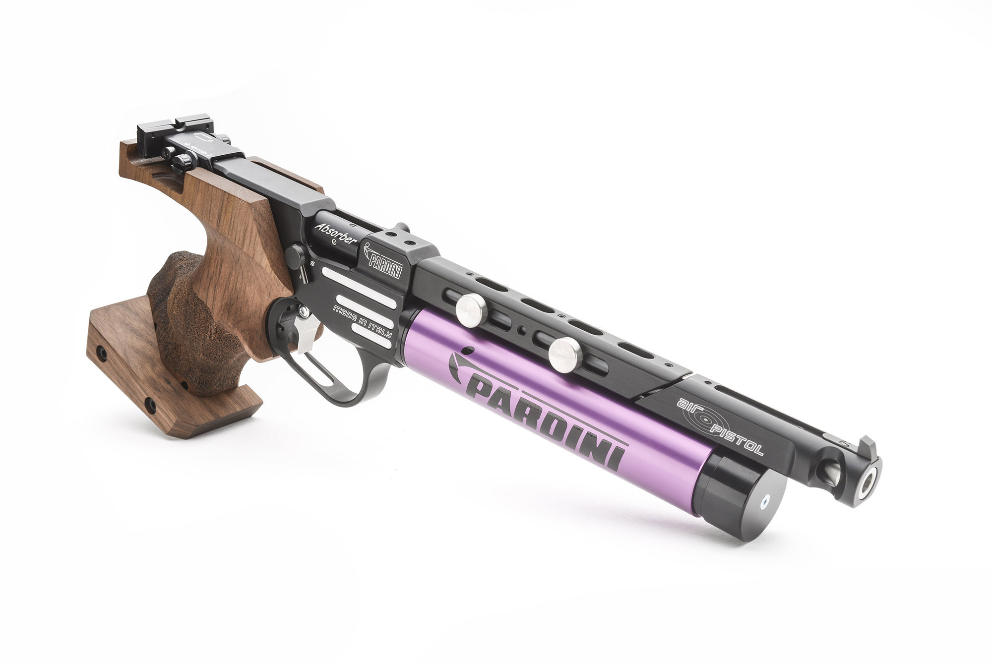 Introduced in 2012, a single shot air pistol, caliber 4.5 mm (.177) with a detachable cylinder for the sole use of compressed air (up to 250 bar), with the air pressure regulator inside of the pistol frame. Innovative shot recoil elimination system located in the bolt (PARDINI patented). All new, fully-adjustable, two-stage trigger with an easily accessible switch for Dry Fire. Fully adjustable rear sight, variable width of the notch, and adjustable sight radius. Wide choice of interchangeable front sights. Anatomical, adjustable walnut grip, available in various sizes. Custom grips or a copy of an already personalized anatomical grip can be made upon special request in our factory. Precise, reliable and easy to read pressure gauge located on the side of the cylinder for immediate and safe reading of the air pressure in the cylinder. Compensated barrel manufactured entirely by Pardini Armi from special steel and blued individually. The combination of extremely high quality control, both in the construction and assembly phases, and numerous innovative and unique innovations used, give this pistol exceptional consistency, absolute precision and excellent stability during the execution of the shot. The K12 New model comes standard with a removable alloy barrel cover which can be applied up to 10 counterweights (10 in Junior model), 5 grams each.